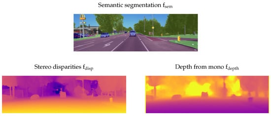 The three input images to our stereo vision-based grid mapping pipeline used in []. © 2021 IEEE. Reprinted, with permission, from Richter, S.; Beck, J.; Wirges, S.; Stiller, C. Semantic Evidential Grid Mapping based on Stereo Vision. In Proceedings of the 2020 IEEE International Conference on Multisensor Fusion and Integration for Intelligent Systems (MFI), Karlsruhe, Germany, 14–16 September 2020, pp. 179–184, doi: 10.1109/MFI49285.2020.9235217.
