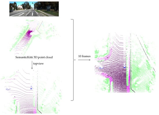 The generation of the ground truth used for the quantitative evaluation. Three-dimensional semantic point clouds from ten frames are merged and mapped into a top-view grid.