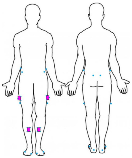 The sampling frequency for the IMU and Vicon systems were 100 and 250 Hz, respectively. IMUs were placed bilaterally on the lower limbs with double-sided hypoallergenic tape halfway between the superior edge of the greater trochanters and lateral epicondyles, halfway between the tibial tuberosities and anterior talocrural joints (Figure 1). Vicon retro-reflective markers were placed on anatomical landmarks of the pelvis and lower limb (Figure 1) consistent with previously published models which align with the International Society of Biomechanics recommendations [39].