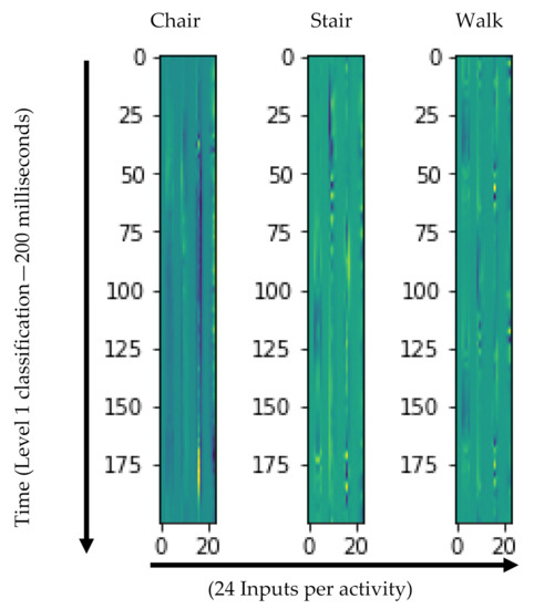 Deep neural networks such as CNNs are ideal for handling image data, like those from IMUs time-series data, which can be arranged into a two-dimensional ‘image’ as an input matrix. Features are then extracted automatically as each activity ideally represents a unique activity ‘image’ pattern (Figure 3). Input included triaxial (x, y, z) accelerometer and gyroscope data from all four IMUs resulting in a total of 24 inputs. Each input was stacked column by column then segmented into fixed size windows according to the level of classification. The images were then converted from a segmented numerical data array of the 12 accelerometer and 12 gyroscope inputs into images by normalizing the dataset to 0–255 range required for digital image production.