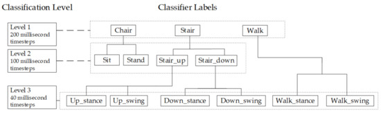 At subsequent levels of classification, our model’s accuracy slightly improved at the second level of classification (range 89–97%), but at the third level of classification, swing and stance phases for stairs and walking, the accuracy (range 60–67%) was reduced. Usually, the accuracy of HAR algorithms reduces for finer levels of classification as predictions become more complex. Our results are consistent with these previous studies, where reductions in accuracy for subsequent level classification have been reported to range between 4.2% and 16.4% [20,24]. While we compared the results of our models to previous HAR literature, the considerable heterogeneity between these studies reduces the capacity to make meaningful comparisons [16]. This heterogeneity arises from a wide variety of factors that include: the type of activities to be classified, the number and location of sensors, the number of activities, the number of training data samples (and participants), the population sampled (e.g., healthy, knee osteoarthritis, Parkinson’s disease) and the validation approach (e.g., LOOCV or k-fold cross-validation).