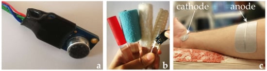 (a) Close-up image of the omnidirectional electret condenser microphone with an amplifier module. An isolation cable was put on the circuit board for an easier grip of the microphone during the stroking and to reduce interference with the components on the printed circuit board (PCB). (b) The experimenter was stroking the different textures with a microphone in a proximal to distal direction. (c) Placement of the electrodes on the participant’s forearm. The cathode was placed over the median nerve while the anode was applied on the upper part of the forearm.