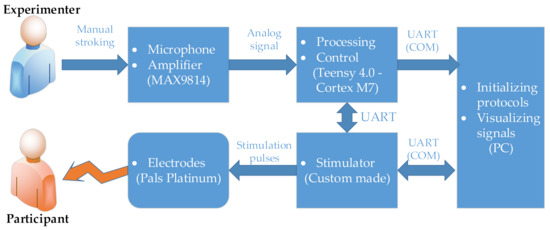 System overview. The manual stroking was performed by the experimenter with an omnidirectional electret microphone with the integrated amplifier. The audio signal was digitized by a Teensy 4.0 microcontroller for further signal processing and signal features extraction. The calculated median frequency was then sent to the custom-made electrical stimulator through a Universal Asynchronous Receiver/Transmitter (UART) connection. The electrical stimulation was then delivered through self-adhesive Pals electrodes attached to the participant’s forearm skin over the median nerve. Both, Teensy and the stimulator were communicating with a PC using their UART connections.
