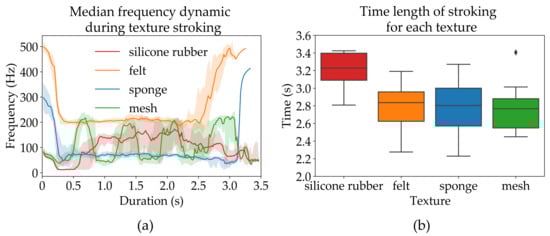 A custom-made LabVIEW program (Labview 2018, National Instruments, Austin, TX, USA) was used to record data during the evaluation stages of the algorithm development. These tests comprised stroking of each texture pseudorandomly by the experimenter and were used for further investigation of the consistency of the stroking. Two factors were explored; the consistency of the time of each stroke and the consistency of the frequency. The data analysis was performed in Python with several libraries, such as Scikit-learn (https://scikit-learn.org/, accessed on 11 November 2020) and SciPy (https://www.scipy.org/, accessed on 11 November 2020).