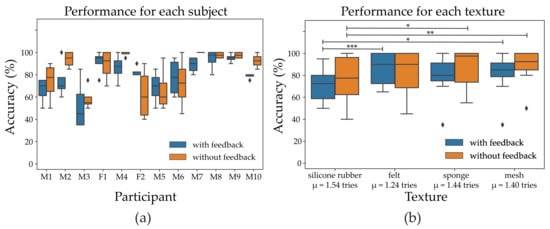 The accuracy of all 12 participants in identifying four different textures are shown in Figure 4a. It should be noted from this figure that the variance of accuracy for different participants is relatively large. Three of the participants had an accuracy higher than 90% in the experimental phase with verbal feedback, while this number increased to six participants during the last phase when no feedback was provided to participants. As the accuracy is not normally distributed, the total accuracy was calculated as the median of individual accuracy. The total median accuracy for all participants and textures was 85% (IQR 70–95%). The participants needed an average of 1.54, 1.24, 1.44, and 1.40 repetitions for each texture (silicone rubber, felt, sponge, and mesh) before responding to the stimulus generated by the different textures. The overall performance for each texture can be seen in Figure 4b. There was a statistically significant difference in terms of phase (with feedback, without feedback, p = 0.034) and texture (p < 0.001). The multiple comparisons test performed on textures per phase revealed there was a statistically significant difference between some of the textures, namely felt vs. silicone rubber in the with feedback condition (p < 0.001), mesh vs. silicone rubber in both feedback conditions (p = 0.016 (w/ FB), p = 0.0086 (w/o FB)), and sponge vs. silicone rubber in the no feedback condition (p = 0.043). For the other combinations there were no statistically significant differences.