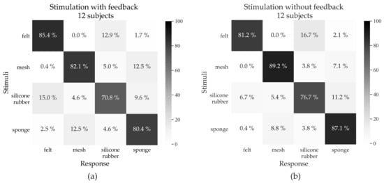 Confusion matrix for the identification of the different textures during the two phases. (a) Phase with feedback, where felt had the highest accuracy (85.4%). The lowest accuracy was when discriminating silicone rubber (70.8%), which was occasionally misinterpreted as felt (15.0%) and as sponge (9.6%). (b) Phase without feedback, where mesh had the highest accuracy (89.2%). In general the performance increased for all textures except felt in the phase without feedback. Mesh is easiest to discriminate (89.2%), sponge has also a high accuracy (87.1%). There was also a small improvement for the silicone texture (76.7% vs. 70.8%).