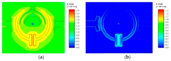 The SRR consists of three metal rings. The outer metal ring is a circular structure with an opening gap at one side. At the same time, two parallel rectangular structure form the sensing area at the opening side; the inner metal ring is two semicircular structures, one of which has the opening gap at the top of the ring. The electric field distributions of the SRR with and without inner metal rings which is simulated by using the High Frequency Structure Simulator (HFSS) software as shown in Figure 2. As can be seen, compared to the single-ring structure, the proposed three-ring structure show a denser electric field concentration at the rectangular sensing area, which means a higher quality factor and a better sensitivity.
