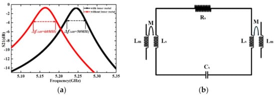 The design work is then carried out by using the High Frequency Structure Simulator (HFSS) software and all the structural parameters of the sensor are listed in Table 1. The electromagnetic wave of the quasi-TEM mode is coupled from the three-stage coupling line to the SRR structure and then coupled out from the other side. The resonance occurs when the electric energy stored in the SRR gap is equal to the magnetic energy in the SRR loop. The Numerically resolved transmission magnitude curve of the microwave sensor with and without the inner metal rings are shown in Figure 3a. The sensor with inner metal rings shows a narrower −3 dB bandwidth, which means the higher Q factor of the sensor. The Q factors of the SRR structure with and without inner metal rings are 104.2 and 86.0, respectively.