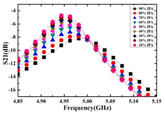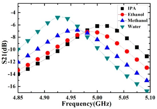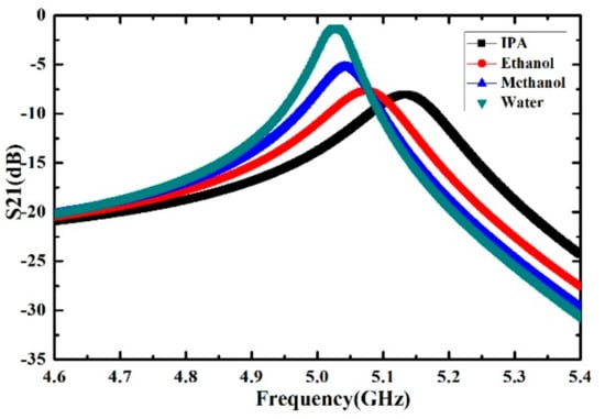 The simulation results of the proposed microwave sensor with different liquid samples (IPA, ethanol, methanol and deionized water) located on the rectangular sensing area are shown in Figure 4. The complex permittivities of the liquid samples are obtained by Debye model at the resonant frequency from [,]. The results show that liquid samples with different complex permittivities correspond to different frequency shift and Q factor. Therefore, the quantitative calculation of complex permittivities for different liquid samples can be achieved by using the proposed microwave sensor.