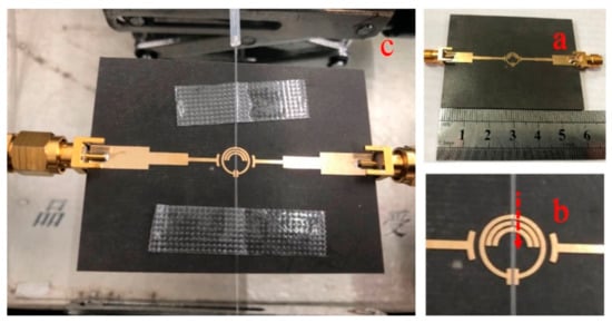 The fabricated structure of the microwave sensor is shown in Figure 5. Rogers/Duriod 5880 with the thickness of 1.57 mm, dielectric constant of 2.2 and loss tangent of 0.0009 is chosen as the substrate. Rogers/Duriod 5880 is widely used in MW/RF circuit design for the uniform electrical properties over wide frequency range and low electrical loss [,]. On the upper surface of the substrate, a 35 μm thick gold-coated copper film with an electrical conductivity of 5.71 × 107 S/m is deposited to construct the pattern of the microwave sensor. On the backside of the substrate, a 70 μm thick copper layer is deposited as the ground. A quartz capillary with inner diameter of 0.288 mm and outer diameter of 0.384 mm is used as the channel of the liquid sample. As shown in Figure 5c, the channel is manually positioned across the SRR structure gap so that the liquid sample can flow straight through the sensing area where the electric field is the strongest. The capillary channel made by quartz can ensure that the volume and shape of the liquid samples remain consistent during the measurement progresses. The resonance peak of the microwave sensor is directly affected by the relative position of the channel and the sensing area. Therefore, during the measurement progress, the position of the channel in the sensing area should remain unchanged to ensure an effective measurement.