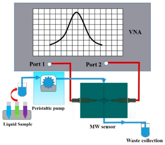 Schematic diagram of the experimental setup. The system is mainly composed of the VNA, peristaltic pump, waste collection and microwave sensor module.