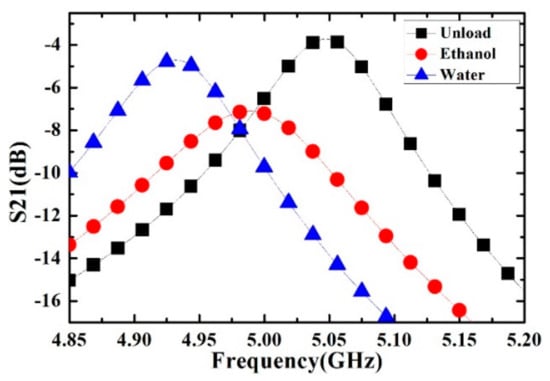Measured transmission response of the microwave sensor. The curves represent different measurement conditions: the sensor with empty channel (unload), the sensor with channel filled with 100% ethanol, and 100% deionized water.