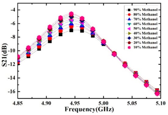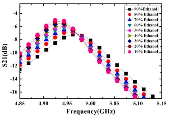 It has been experimentally verified that the continuous flow does not affect the measurement results, as long as the pressure is low enough to avoid the channel deformation. Each kind of liquid sample is measured for five times to reduce the measurement error. During the entire measurement process, the temperature and the humidity ware maintained at 25 °C and 40%, respectively. When the microwave SRR sensor is completely exposed to free space without a capillary channel above the gap, the resonance frequency and Q factor are the highest. When the capillary channel covers the electric field sensitive area of the gap, the resonance frequency and Q factor are slightly reduced. Depending on the complex permittivity of different liquid samples, the resonance characteristics of the microwave sensor change accordingly. The transmission responses of the microwave sensor are shown in Figure 7.