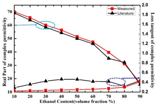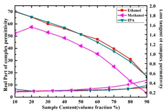Then Equations (8)–(10) were used for the calculation of complex permittivity of the mixture ethanol-water, methanol-water and IPA-water solution from the parameter value listed in Table 5, Table 6 and Table 7. In the measurement, the εsam represents the complex permittivity of different volume fraction of ethanol solution. The real part and loss tangent of different volume fractions of ethanol solutions calculated by Equations (8)–(10) are shown in Figure 13. The results show that, as the increase of ethanol content, the real part of the complex permittivity of ethanol-water solution decrease, while the loss tangent of the complex permittivity increase.