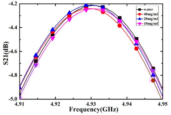 Inositol powder with a purity of 99.6% was purchased from Shanghai Macklin Bio-chemical Co., Ltd. (Shanghai, China). The deionized water was purchased from Chengdu Kelong Chemical Co., Ltd. (Chengdu, China). Inositol solutions with concentrations of 10, 20 and 40 mg/mL are obtained by mixing the inositol powder and deionized water. For different concentrations of inositol solution and deionized water, the measured transmission response curves are shown in Figure 15, the corresponding frequency shifts and the Q factors of the transmission response are listed in Table 9. As the concentration of inositol solution increases, the frequency shift also increases. Therefore, we can qualitatively estimate the level of inositol concentration through the value of the frequency shift.