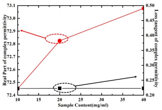 The real part and loss tangent of inositol solution with different concentration have been shown in Figure 16. As can be seen, the real part of the complex permittivity of inositol solution increases with the increase of concentration, while the loss tangent change is relatively small. These results show that the proposed sensor has the ability to distinguish the different concentrations of inositol solutions, which can be further improved on requirement.