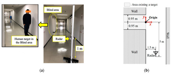 Another approach for addressing the issues of pedestrian recognition in blind areas is a remote sensing-based scheme using cameras and lidars [9]. Because these sensors can recognize different measurement areas, the sensor fusion approach to detect pedestrians in the blind area (occluded pedestrians) has been studied [10]. However, these techniques assumed that the pedestrians are partially visible and almost all studies do not assume the pedestrians that are completely invisible. Furthermore, these conventional studies mainly focus on the detection and recognition of target types (e.g., human or not) and the consideration of rush-out risk is not assumed to the authors’ best knowledge. To address the problems mentioned above, radar sensing can be used to detect humans and objects in blind areas owing to the propagation characteristics of radio waves, including diffraction and multiple reflections. For example, Fujita et al. and Johansson et al. [11,12] proposed a radar imaging method that uses multiple reflected waves from walls. Such methods use reflections from multiple walls to detect objects in blind areas that are invisible to the radar installed indoors. Additionally, Zhang et al. [13] proposed a radar imaging technique using a diffraction phenomenon to detect an object behind a wall through which radio waves cannot pass. However, in these studies, experiments were performed in an anechoic chamber or in an environment surrounded by omnidirectional walls and through simulation-based investigations. Furthermore, there are only a few studies on the detection of pedestrians in blind areas. Bartsch et al. [14] investigated the detection of pedestrians occluded by cars based on a range-Doppler map. However, the accuracy of their method was not fully verified, and it aimed to classify pedestrians or static objects. Furthermore, the effects on radio propagation are not discussed and its applicability to the completely invisible blind area composed by the walls is not confirmed, similar to the previous studies that used cameras and lidars Additionally, the detection of rush-out behaviors was not considered. He et al. [15] recently presented experimental results on the classification of objects in blind areas. However, this study showed only the classification of humans and metallic cylinders through experiments in a laboratory setting. Therefore, there are no reports on the investigation of radar-based detection of the movements of pedestrians in blind areas, including rush-out behaviors in a realistic environment.