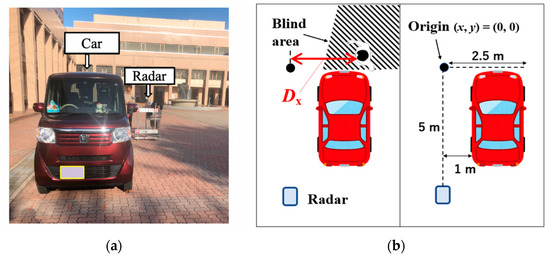 We also performed experiments for an outdoor environment in which the blind area was formed using a car. Figure 3 depicts the experimental site and radar measurement system model used in the outdoor environment. There were no reflective objects, such as walls, around the vehicle. Therefore, multipath from the surrounding environment could not be obtained. The same radar used in the experiments for the indoor environment was used in the outdoor environment. The radar was installed 1 m away from the vehicle along the x-axis. In Figure 3, radar heights were set to 0.1 m. The aim of the height of 0.1 m was to propagate radio waves in the lower space between the car and ground. The subjects walked close to the car. The car used in the experiment was N-BOX, which is manufactured by Honda Motor Co., Ltd. (Tokyo, Japan). The total height, width, and overall length of this car are 1.8 m, 1.475 m, and 3.495 m, respectively.