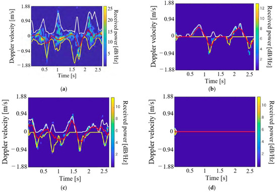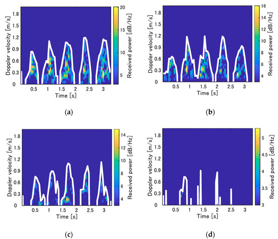 Spectrograms of the human subject who walked in place for each Dx and their maximum velocity envelope (white solid line) (indoor environment). (a) Dx = 0.5 m; (b) Dx = 0.7 m; (c) Dx = 0.9 m; (d) Dx = 1.1 m.