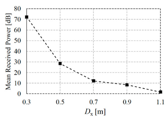 We first demonstrate the ability of the system to detect the human walking movements in the blind area behind the wall. The experiment was conducted in an indoor environment. The experimental participant was a man aged 22 years with a height of 173 cm. He walked at the position (x, y) = (−Dx, 0.55 m). The mean of the received power of the components in the spectrogram corresponding to the reflected waves from the subject was calculated for several Dx values. Figure 4 depicts the spectrograms for Dx = 0.5 m, 0.7 m, 0.9 m, and 1.1 m, and the maximum velocity envelopes that correspond to the leg swinging while walking. When Dx is less than 0.9 m, the periodic components corresponding to the subject walking can be confirmed. The subject at Dx = 0.5 m exists in the blind area, and thus, it is possible to detect the subject’s movements using the diffracted waves and multiple reflected waves. However, the mean received power is significantly reduced for Dx = 1.1 m, which can make the recognition of the movements using measured data difficult. Therefore, it is difficult to estimate the periodic walking component of the subject at Dx = 1.1 m in this environment. Figure 5 depicts the results of the mean received power corresponding to the significant peaks in the spectrogram for each Dx. The received power is attenuated to approximately 2% between Dx = 0.3 m and Dx = 1.1 m, which implies that the detection capability is significantly reduced for larger Dx.