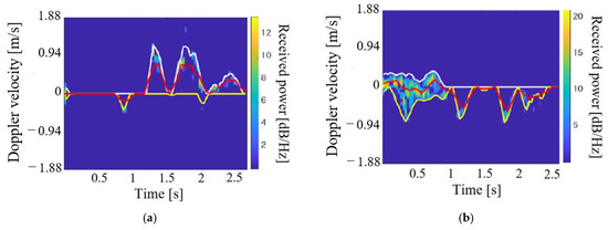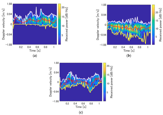 Representative spectrograms for each motion type (indoor environment). The white, yellow, and red lines correspond to maximum velocity, minimum velocity, and maximum power components for each time, respectively. (a) blind area to the visible area (BtoV) type; (b) visible area to the blind area (VtoB) type; (c) walking in place in the blind area (WiP) type.