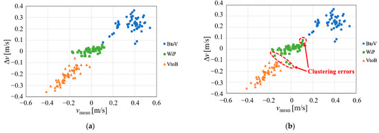 Figure 7 depicts the classification results using Ward’s clustering method, whose feature parameters are vmean and Δv. Clearly, there were significant differences in each movement type. The difference between the maximum and minimum velocity components emphasized the small difference in the WiP type between the legs, making it easy to distinguish them from the other two types. In the other two types, the difference between the positive and negative of the bias of the velocity component appears with both parameters, making it easy to distinguish them. Thus, the clustering results depicted in Figure 7b indicate that there were only four misclusters, which corresponded to a clustering rate of 97.5%.