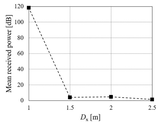 Similar to the experiments for the indoor environment, we first investigated whether pedestrians in the blind area formed by the vehicle could be detected with sufficient received power. The subject was a man aged 23 years of height of 169 cm. He stamped in (x, y) = (Dx, 0 m). The mean of the received power of the components in the spectrogram corresponding to the reflected waves from the subject was calculated for several Dx values. Figure 8 depicts the spectrograms for Dx = 1.0 m, 1.5 m, 2.0 m, and 2.5 m. As shown in Figure 8, the periodic components of the walking motion can be confirmed when Dx = 1.0 m, 1.5 m, and 2.0 m. In contrast, it is difficult to detect walking motion at Dx = 2.5 m because the received power is significantly reduced. In terms of the radar, the subject’s foot at Dx = 2.5 m overlaps the vehicle’s right front wheel. Therefore, it is considered difficult to detect the subject because the radio waves do not propagate directly. When the subject at Dx = 1.0 m was stationary, most of the subject was not directly visible from the radar. However, when the subject performed a walking motion there, his hands and feet were directly visible. On the other hand, when the subject with Dx = 1.5 m performed a walking motion, the subject’s toes were visible through the lower space of the vehicle. Therefore, there was a large difference in spectrogram received power between Dx = 1.0 m and 1.5 m. Figure 9 depicts the results of the mean received power corresponding to the significant peaks in the spectrogram for each Dx. The received power is strongly attenuated for Dx = 1.5–2.5 m compared with that for Dx = 1.0 m. The mean received powers for Dx = 1.5 and 2.0 m were approximately 4 dB, which implies the smaller detection capability. However, as indicated in the spectrograms, some features of the motions can be confirmed in these cases. In contrast, the received power for Dx = 2.5 m was approximately 1 dB and the detection of the subject was difficult. From the above results, it is possible to detect the pedestrian in the blind area using radar by propagating radio waves to the space under the vehicle and measuring the walking motion of the subject’s toes including the smaller received power cases for Dx = 1.5 and 2.0 m.