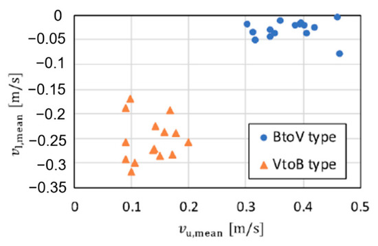 Next, we demonstrate the clustering of motions with different rush-out risks in the outdoor environment. For simplicity, we assume the classification of the BtoV and VtoB types. The experimental participants were three healthy young men (21–23 years old, with a mean height of 170.0 cm). The participants performed the two motion types five times each. Therefore, the numbers of data for the clustering were 15 for each motion type. Figure 10 depicts the representative spectrograms for each walking motion type. The leg movements during walking are illustrated as abrupt velocity changes in the spectrogram. From the BtoV type spectrogram, it is possible to measure the walking motion for approximately three steps immediately before rushing out. In contrast, the VtoB type has a toe at the start of walking (1.0 m, 0 m), as shown in Figure 3b. Therefore, the velocity component of one step, including the received signal of the entire subject’s body from the start of measurement to approximately 1.0 s and approximately three steps of walking in the blind area can be measured from the spectrogram. Figure 11 depicts the clustering results using the extracted parameters vu,mean and vl,mean. Clearly, the accuracy was 100% for the classification of the two motion types owing to their clear divergence in the maximum and minimum envelopes, as indicated in Figure 10.
