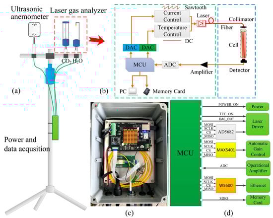 Schematic of the laser gas analyzer and experimental setup for flux measurements. (a) the three major components of the system; (b–d) details of the miniaturized TDLAS system.
