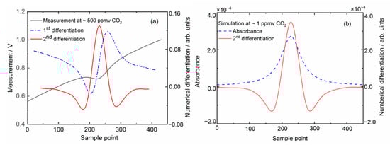 Figure 3a shows one example of a CO2 measurement spectrum and the associated 1st and 2nd derivatives obtained via a Savitzky–Golay filtering. The transmission spectrum was acquired for samples of ~500 ppmv CO2 by the ADC with 450 data points, and averaged 16 times in successive laser current scans. Simulations of the absorbance and 2nd differentiation spectrum at 1 ppmv CO2 concentration are displayed in Figure 3b. The 16 bits ADC for recording the photodetector signal has sufficient resolution (i.e., 1/65,535) to cover concentrations from ~2000 ppmv down to sub ppmv. Our noise-limited detection sensitivity corresponds to an absorbance level of ~1.5 × 10−4.
