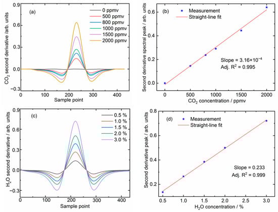 Numerically processed second derivative spectra of measurements at different gas concentrations of (a) CO2 and (c) H2O. The corresponding straight-line fits of the spectral peak magnitudes to the gas concentrations are displayed in (b,d).
