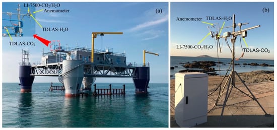 In order to test the performance of the developed gas analyzer for H2O and CO2 fluxes measurements under low and high wind speed environments, we conducted the field measurements at two distinctive sites, as depicted in Figure 6. Figure 6a shows the installation of our integrated instruments and an ultrasonic anemometer on an offshore platform in the Yellow Sea of Yan-tai city in Shandong province (Site-A) with high-wind-speed marine environment. Figure 6b shows the installation on the Jue-hua Island of Huludao city in Liaoning province (Site-B) with low-wind-speed terrestrial environment. The commercial LI-7500-CO2/H2O instrument is also installed nearby to calibrate and compare the accuracy of measurements.