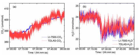Comparison measurements between the laser gas analyzer and an LI-7500-CO2/H2O for an hour. (a) CO2 and (b) H2O measurements. The data rate of the TDLAS was at 100 Hz (with only one-fifth of the data points plotted in the graphs), whereas the LI-7500 was at its max 20 Hz.