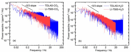 For the investigation of the frequency characteristics of the measurements and the time response of the instruments, we applied the frequency power density method to analyze the recorded time series of the concentration data []. Figure 8a,b show the comparison of power density spectra for CO2 and H2O concentrations between the laser gas analyzer and LI-7500 analyzer via a fast Fourier transform method. The slope of spectra (ploted in log–log scales) is approximate to −5/3 of the Kolmogorov theory in the inertial subrange [], indicating that the laser gas analyzer is capable of measuring turbulence fluxes of CO2 and H2O via EC method.