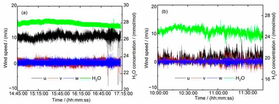 Measurement data of H2O concentrations and three-dimensional wind velocities (u, v for the two horizontal components, w for vertical). (a) Data of Site-A. (b) Data of Site-B.