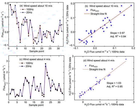 As described in Figure 10a,b, the H2O fluxes computed for data rates of 20 Hz and 100 Hz can differ by up to 16% (adjustable R2 = 0.84) in the 10 m/s wind speed environment. As a comparison, the difference of H2O fluxes is about 5% (adjustable R2 = 0.95) in the 4 m/s wind speed environment, shown in Figure 10c,d. The difference suggests that the contribution of 100 Hz flux measurements increases by about 11%, as wind speed changes from 4 m/s to 10 m/s. The data points spread out further away from the straight-line in Figure 10b than in Figure 10d.