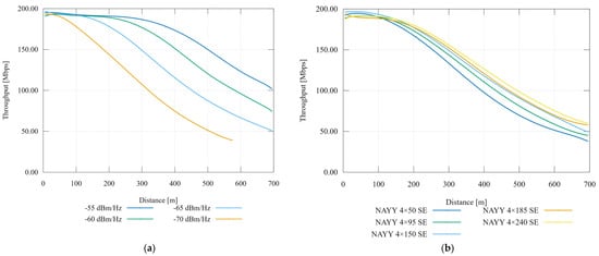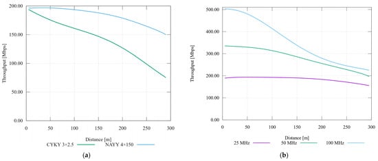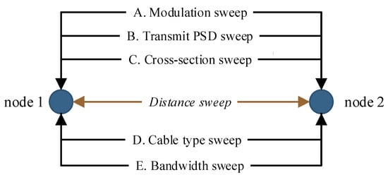 There are also similar tools in the Matlab environment, but they do not have NS-3 potential and capabilities, especially for the purpose of combining different network technologies in one hybrid topology, i.e., Cañete [] or FTW [,]. The source codes for the FTW simulator are also available for NS-3. The comparison of these simulators is dealt with in []. The configuration file (Matlab type) is available for the Cañete simulator only. It is not possible to apply custom model algorithms, but only set values for parameters, which is considerably limiting. All these allow simulation in extensive topologies. These simulators are focused on physical layers (channel frequency response) and RLGC parameters.