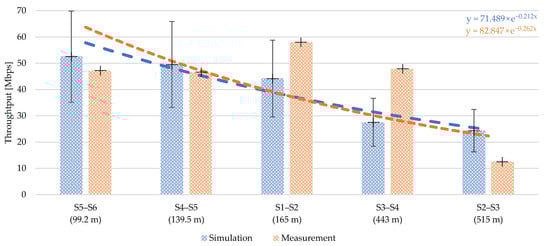 This part deals with papers where the network simulations correlate with a real measurement of a network, such as a smart grid. Ref. [] was mentioned in Section 2.3.1 as a reference to HPAV simulations in NS-2. The HPAV recommendations are not intended for smart grid application, but the simulations should match real scenarios of BPLC systems. The simulation setup is presented in detail where the medium access method, data segmentation of UDP, TCP traffic and queue processing techniques were used for performance evaluation. The paper presents the developed HPAV model in a validation process by the average throughput comparison of the simulated model and the real system. The real HPAV system configuration is not described and the specific name of the HPAV device is not given, but only the information that the configuration of used devices is based on the default parameters specification of the HPAV. This paper demonstrates the fact that an NS-2 simulator can produce almost the same simulation results as the measured results of a real BPLC system.