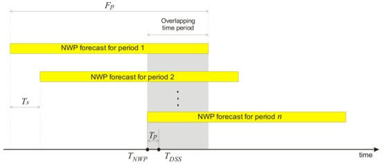 Ideally, the correction algorithm should get all forecasts at time . However, a delay of can occur between the end time of forecast modelling and the time when DSS gets the data, which is a result of a data synchronization process between the modelling system and decision support system. It may last from several seconds to several hours, depending on the infrastructural and business relationships between the NWP forecast provider and decision support system user.