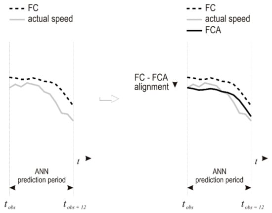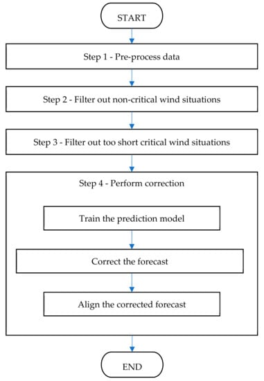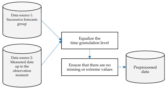 The first step is data pre-processing (Figure 3). We used two types of input data: successive overlapping forecasts for a future 12 h period, and actual measured data up to the observation moment. In the pre-processing step, all input data are normalized to the same time granulation level (in our case, 1 h) and it is ensured that there are no missing or extreme values in the data set. Additionally, one should be aware that accuracy of corrected wind speed obtained by running the FOCUSED algorithm is also subject to input data integrity issues. In this research we used validated data sets, but in order to offer a universal guide we should point out the need to address integrity issues as well. They can arise from two main directions: (a) unintentionally unreliable measurements (hardware or software errors or malfunctions) or (b) intentional data disruption–e.g., cyber-attacks related to data integrity that are expected to harm the performances of forecasting systems [], or false data injection attacks against wind power deterministic and probabilistic forecasting [].