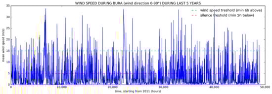 The next step is the filtering of non-critical wind situations from the data set. This step is important because the algorithm is intended to support decisions regarding road closure or speed limitations during strong wind situations, hence the need to isolate only such conditions. To distinguish critical from non-critical wind situations, we defined the starting and the ending point of the single bora period. For the purpose of this study which uses continuous data from five consecutive years, we identified a critical bora situation as the wind that blows from any direction between north and east (0–90°), whose average hourly speed remains above wind speed threshold for at least 6 h and lasts until the speed drops below the silence threshold for at least 5 h. In Croatia, a wind speed that is higher than 17 m/s represents one of national weather alert criteria []. Therefore, the upper wind speed threshold is set to that speed, and for the same reason the silence threshold is set to 5 m/s, just below the lower boundary during icy road condition periods. In Figure 4, we show an example of an hourly average measurements during the five years with upper and lower boundaries used to identify critical wind situations.