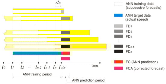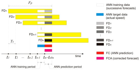 Consider that is 72 h and is 12 h. At the time t1, the NWP model has created a forecast for the next 72 h, denoted as FD1. At the time t2, the NWP model makes a new forecast for the next 72 h denoted as FD2, and so on. During one period, the NWP model makes six forecasts whose lengths are equal to the period. In application where the proposed algorithm is used as a part of real-time decision support system, the modelling process should repeat each hour, immediately after receiving new measured hourly wind-speed data. When the critical wind situation lasts longer than , the training set becomes larger than (Figure 6). Every new NWP forecast becomes FDn. Previous FDn becomes FDn−1, and at the end FD2 becomes FD1, hence the training set could grow indefinitely.