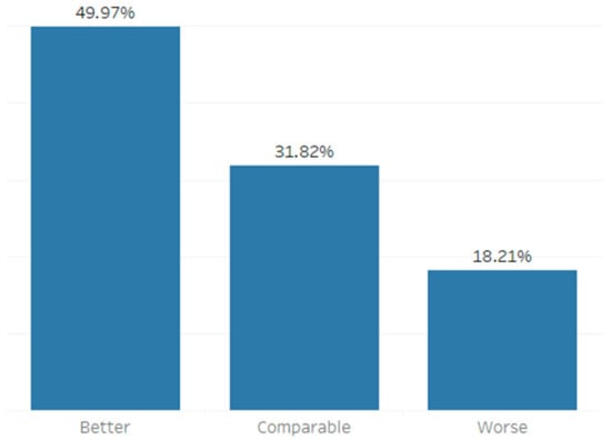 When we visualize the last NWP forecast (FD6) and the corrected forecast (FCA) during a longer period, we can spot better prevailing accuracy of FCA for one year. Figure 14 shows an example for year 2016—the comparison of FD6 (the newest and considered the most relevant before correction) and FCA for all training samples longer than or equal to 12 h. Comparison is made for all observation points (hours) in the whole data set, using only data from the 12th hour after the bora start (minimal training sample size is 12). The figure also shows relatively rare “Worse” situations, represented as high peaks on the graph. Those periods are typically short and followed by fast stabilization, resulting in further improvement of the model’s accuracy.