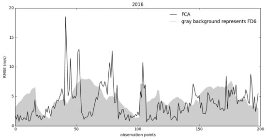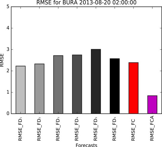 This example is also interesting because the oldest prediction (72 h old, denoted as RMSE_FD1) is more accurate than the newest one (denoted as RMSE_FD6). The comparison of RMSE in the example of bora (Figure 11) shows the strength of the proposed algorithm to reduce the overall error of original forecasts, regardless of their order.