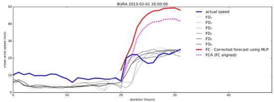 Figure 11 shows an example of the “Better” category sample. We present the first 20 h of six consecutive forecasts annotated with grey lines and increasing numbers. These forecasts are the source for the ANN. The oldest forecast is marked as FD1 and presented with the light grey line. It refers to the forecast created 72 h ago. The next one, created 60 h ago, is marked FD2 and is a bit darker than FD1. The last (most shaded grey) forecast, marked as FD6, represents the newest result of the ALADIN model. FC represents the direct output of the ANN model. A challenge has arisen as the prediction of the model revealed the most probable shape of the final forecast, but the overall wind speed was often shifted across ordinate of the graph, causing increased RMSE. To correct that, we aligned the curve’s wind speed starting point with the last measured data point. The FCA represents the aligned (final) corrected forecast.