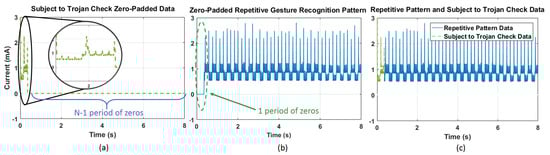 (a) Zero padded data that is subjected to Trojan check; (b) zero-padded repetitive gesture recognition pattern with one period of zero padding at the starting; (c) stitched one period of data to repetitive gesture recognition data.
