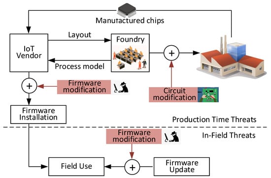 Figure 3 illustrates attack models for potential hardware and firmware Trojan threats. The IoT vendor receives the process model from the foundry and produces the circuit layout using this process model. Malicious modifications can be added at production time or while the device is in use in the field. The threats can originate at the foundry, during firmware design, or production firmware installation. There can be circuit modifications and firmware modifications. Hardware threats originate at the foundry from malicious attackers (e.g., third-party consultants, rogue employees) who modify the hardware to insert malicious circuitry. When triggered by prespecified analog or digital conditions, the modifications can have passive effects, such as leaking information [8], or cause malfunction (e.g., by heating the device). The analog trigger mechanisms include temperature, device aging, or signal delay between two points [9]. Similarly, digital conditions can be implemented as combinational or sequential circuits [10]. Firmware threats can be added during firmware installation at the IoT vendor or other third-party company. The attacker can also make firmware changes during field updates. These changes can require physical contact to the device [11] or done remotely through any network connectivity, such as Bluetooth and Wi-Fi. Majority of firmware updates are delivered via the internet, opening doors to the attackers to invade the device remotely [12]. Hence, every product in the field needs periodic monitoring to verify recent changes made to the system.