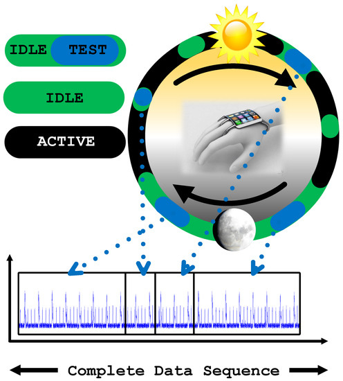 Memory has always been a difficult delicate balance in wearable systems. Unlike personal computers (PCs), tablets, and other devices, wearable devices have significantly smaller memory capacity. However, the memory capacity still must be adequate to support the required functionality and the device firmware. With their expansive growth in popularity, users expect more features and performance from wearable and IoT devices, but these features cannot come at the expense of basic functionality. In other words, improved processing and memory capacity should come with improved security and privacy features. Thus, the memory is a requirement for the proposed malicious activity detection. To this end, performing data collection and analysis during idle times means there will free memory that is sufficient for running the detection algorithm. As seen in Figure 4, the device is monitored and during its idle time, part of the data are measured. This data are stitched with previously collected data samples to synthesize a complete data sequence. When the required data sequence is collected, frequency domain analysis can be run.