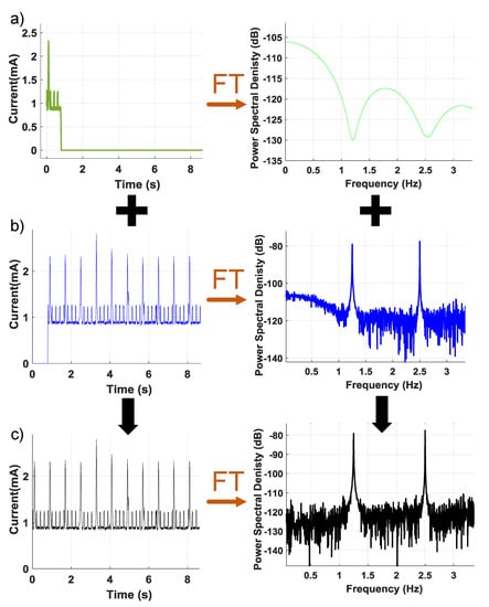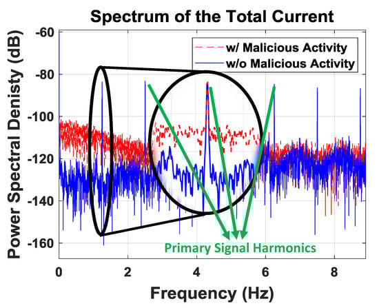 where is the sinusoidal power consumption of the primary circuit, denotes the error that we make in setting up the sine wave, is random noise, and is the power consumption of the Trojan circuit [2,47,48]. The power spectrum of the primary signal, i.e., is concentrated in one frequency location. The noise signal has a flat spectral signature. While the specific details of the Trojan activity are unknown, its switching speed is clearly limited by the system clock. It is also unlikely that the Trojan activity period will match with the primary signal periodicity. Therefore, the FFTs of Trojan and primary activity will inevitably occupy different frequency bins. As a result, the Trojan signal bandwidth will be limited, making it different from white noise and the primary signal. The spectrum of is the sum of the spectra of its components. The primary signal, is concentrated in one frequency location. The error signal, , can be modeled as a pulse train: