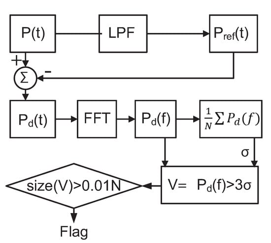 The proposed detection algorithm is shown in Figure 7. We sample and process the composite power signal in the digital domain. We first pass the power signal through a low-pass filter, whose cut-off frequency is chosen to include harmonics of the primary signal that are above the noise floor. The resulting signal is subtracted from that of to exclude primary signal components from the analysis. The resulting residual time-domain signal contains noise, the majority of the Trojan signal energy, and some additional components due to modeling effects. The noise level, , can be determined from the residual spectrum by taking an average of the spectrum. To avoid false positives due to noise, we set a spectrum threshold of (corresponding to a confidence level of nearly 99.7%), and record spectral components (V) exceeding this threshold. We extend the mathematical model to remove the need for sinusoidal excitation, which may not be practical in an Internet of Things (IoT) context. Similarly, there is a need for techniques to detect malicious activity in lower power IoT devices. To this purpose, this paper uses a random repetitive pattern to operate the device under test so that its current consumption is pushed into a PSS. At the same time, the Trojan is excited in an uncorrelated state. In this way, the system’s output is decoupled from that of the Trojan activity and the noise.